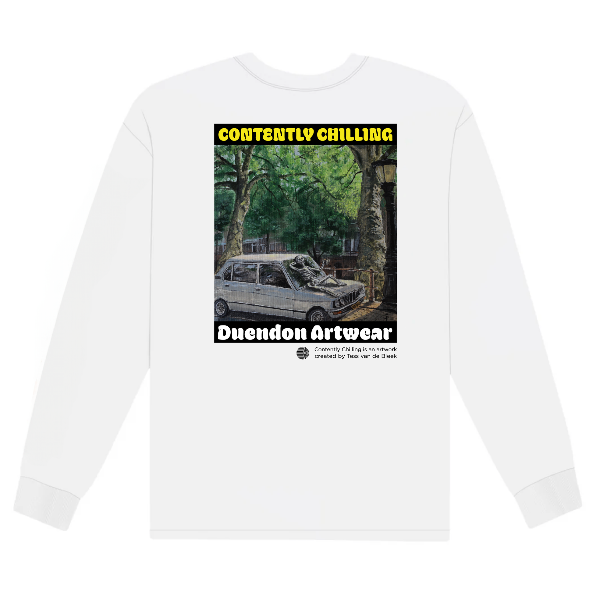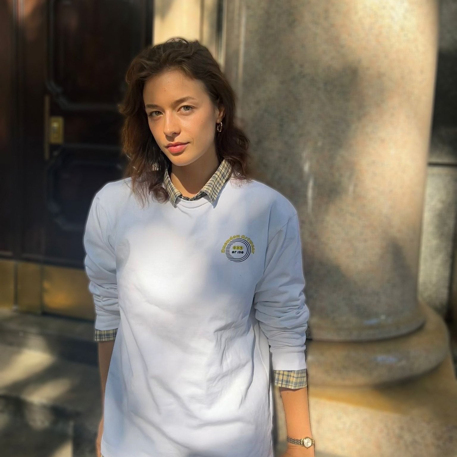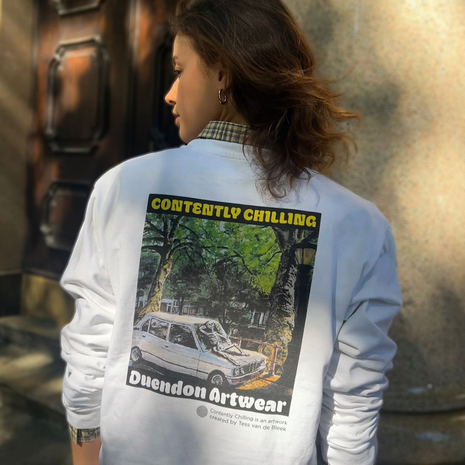 This long-sleeved, relaxed-fit shirt was designed by the art of Tess van de Bleek, a student and model from the Netherlands. She creates art as a hobby and posts (some of it) on Instagram under the name Ted Sainsi. The shirts features a painting of the Oude Gracht in Utrecht with a typical skeleton that Tess uses in more of her works.